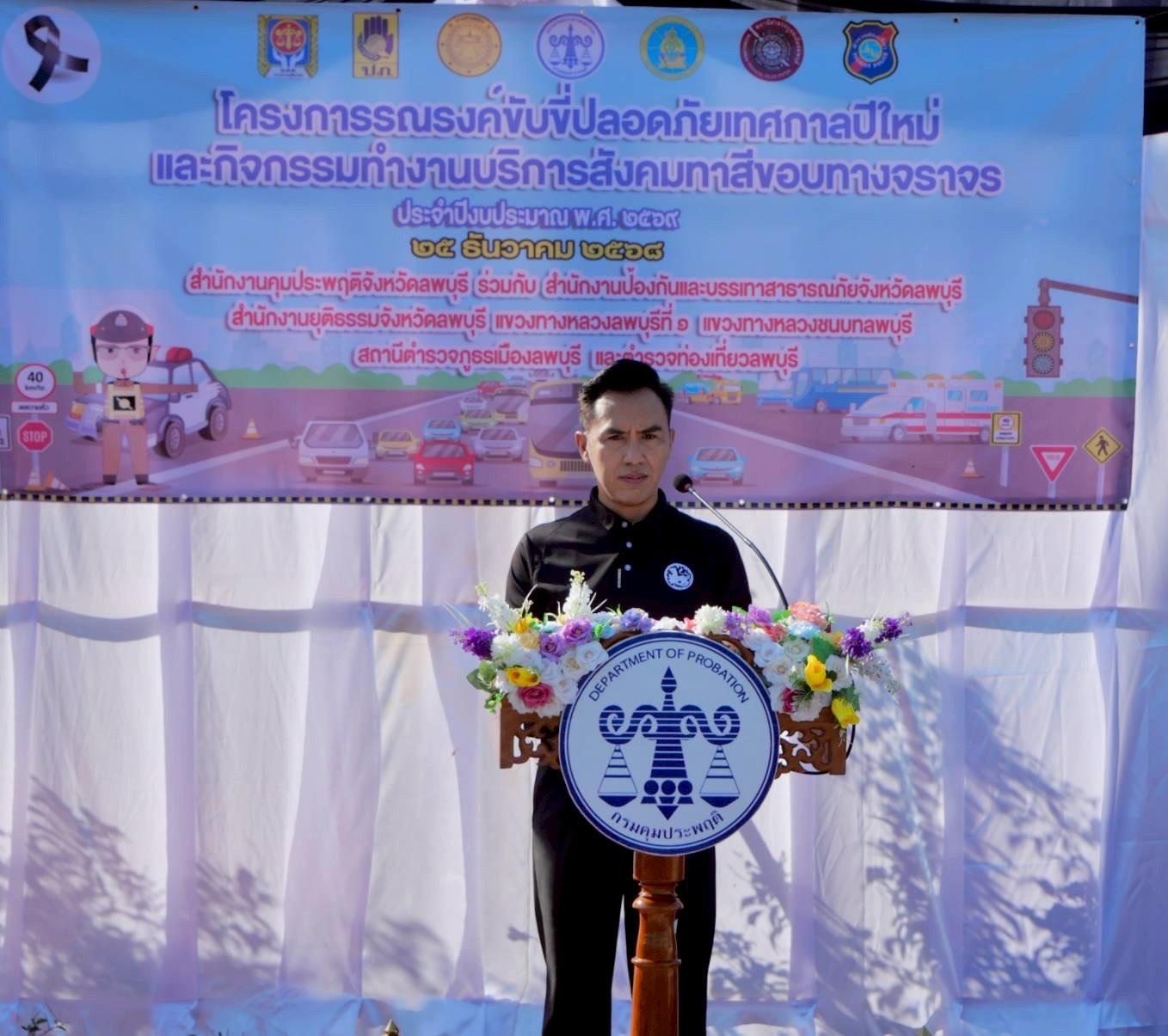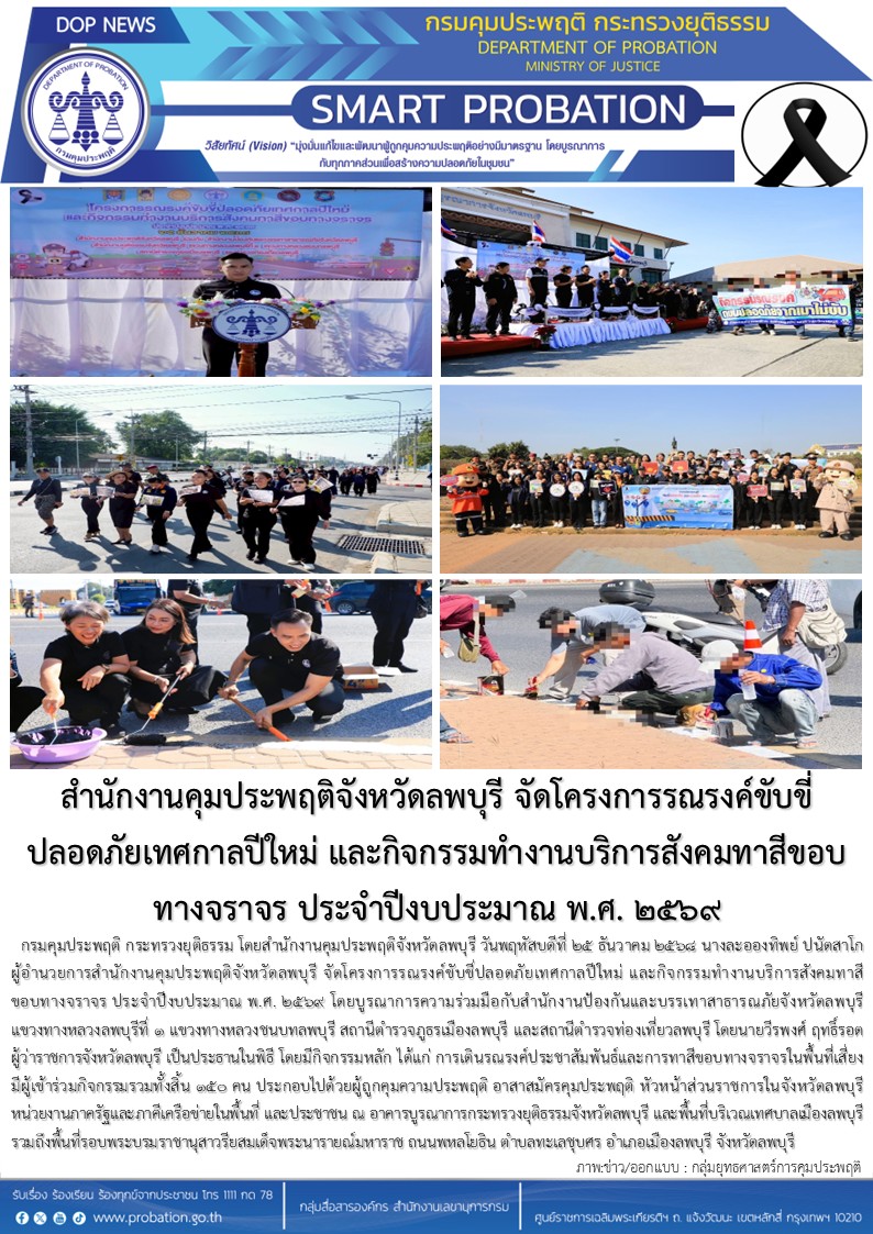 สำนักงานคุมประพฤติจังหวัดลพบุรี จัดโครงการรณรงค์ขับขี่ปลอดภัยเทศกาลปีใหม่ และกิจกรรมทำงานบริการสังคมทาสีขอบทางจราจร ประจำปีงบประมาณ พ.ศ. ๒๕๖๙