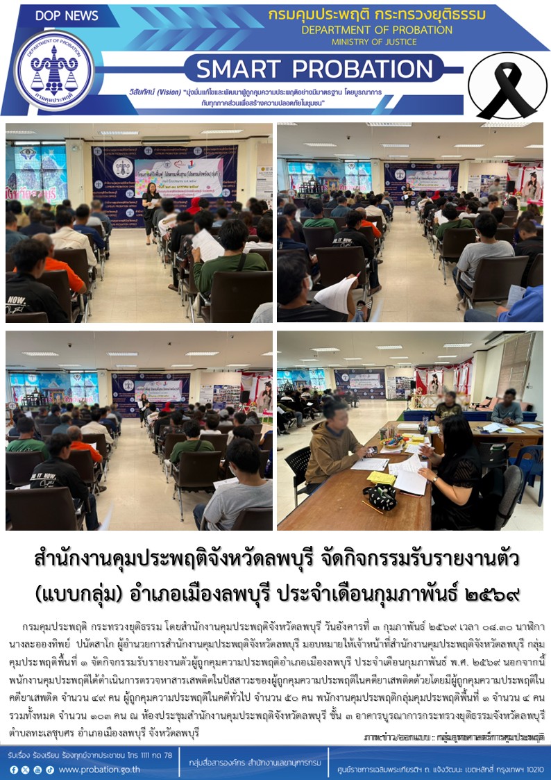 สำนักงานคุมประพฤติจังหวัดลพบุรี จัดกิจกรรมรับรายงานตัว(แบบกลุ่ม) อำเภอเมืองลพบุรี ประจำเดือนกุมภาพันธ์ ๒๕๖๙