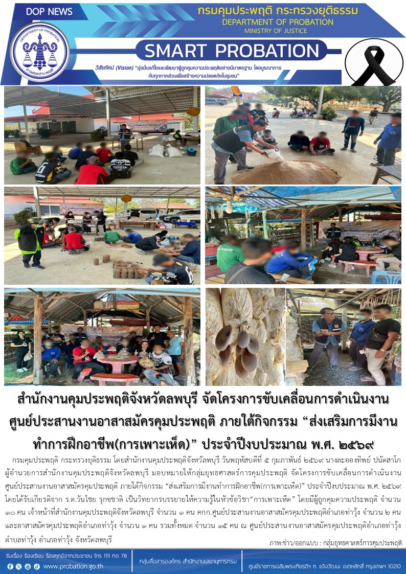 จัดโครงการขับเคลื่อนการดำเนินงานศูนย์ประสานงานอาสาสมัครคุมประพฤติ ภายใต้กิจกรรม “ส่งเสริมการมีงานทำการฝึกอาชีพ(การเพาะเห็ด)” ประจำปีงบประมาณ พ.ศ. ๒๕๖๙ โดยได้รับเกียรติจาก ร.ต.วันไชย รุกขชาติ เป็นวิทยากรบรรยายให้ความรู้ในหัวข้อวิชา“การเพาะเห็ด” โดยมีผู้ถูกคุมความประพฤติ จำนวน ๑๐ คน จนท. จำนวน ๑ คน คกก.ศูนย์ประสานงานอาสาสมัครคุมประพฤติอำเภอท่าวุ้ง จำนวน ๒ คน และอ.ส.ค.อำเภอท่าวุ้ง จำนวน ๑ คน รวมทั้งหมดจำนวน ๑๕ คน ณ ศูนย์ประสานงานอาสาสมัครคุมประพฤติอำเภอท่าวุ้ง ตำบลท่าวุ้ง อำเภอท่าวุ้ง จังหวัดลพบุรี