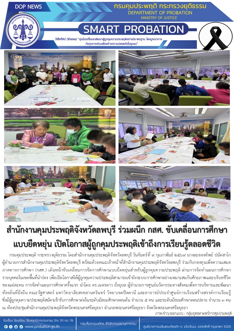 เปิดโอกาสให้ผู้ถูกคุมความประพฤติสามารถเข้าถึงระบบการจัดทำแผนการศึกษาครั้งแรก นำโดย ดร.เนตรดาว ยั่งยุบล ผู้อำนวยการศูนย์นวัตกรรมทางสังคมเพื่อการบริหารและพัฒนาท้องถิ่นที่ยั่งยืน คณะรัฐศาสตร์ มหาวิทยาลัยสงขลานครินทร์ วิทยาเขตปัตตานี และอาจารย์ประจำศูนย์การเรียนสร้างสรรค์การเรียนรู้ ซึ่งมีผู้ถูกคุมความประพฤติสมัครเข้ารับการศึกษาต่อในระดับมัธยมศึกษาตอนต้น จำนวน ๕ คน และระดับมัธยมศึกษาตอนปลาย จำนวน ๓ คน ณ ห้องประชุมสำนักงานคุมประพฤติจังหวัดพระนครศรีอยุธยา อำเภอพระนครศรีอยุธยา จังหวัดพระนครศรีอยุธยา