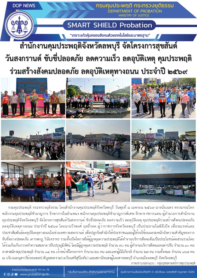 สำนักงานคุมประพฤติจังหวัดลพบุรี จัดโครงการสุขสันต์ วันสงกรานต์ ขับขี่ปลอดภัย ลดความเร็ว ลดอุบัติเหตุ คุมประพฤติร่วมสร้างสังคมปลอดภัย ลดอุบัติเหตุทางถนน ประจำปี ๒๕๖๙